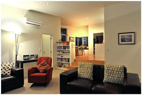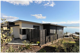 Built in 2008, the solidly constructed, 168 square metre home combines low maintenance weatherboard walls and pale cream plastered feature walls with anodised aluminium joinery and a charcoal Coloursteel roof. There is an additional, 30 square metre kwila front deck, enclosed by safety glass balustrades and a 16 square metre timber deck, outside the dining room, enclosed by oriental slatted timber screens, with gates on two sides.